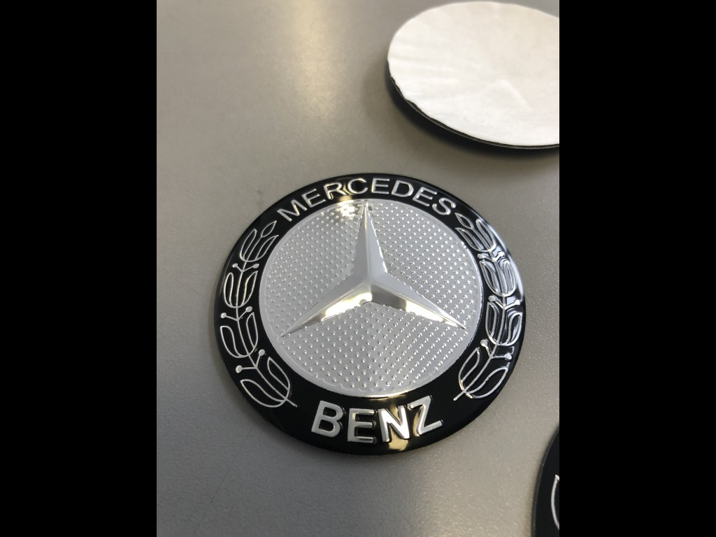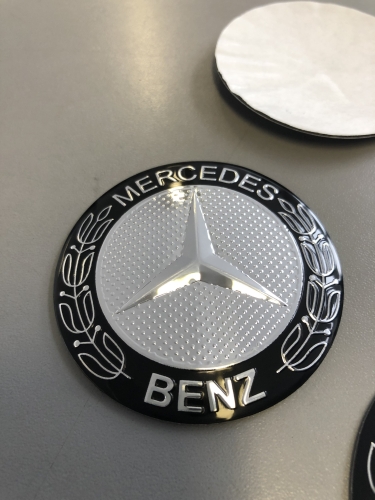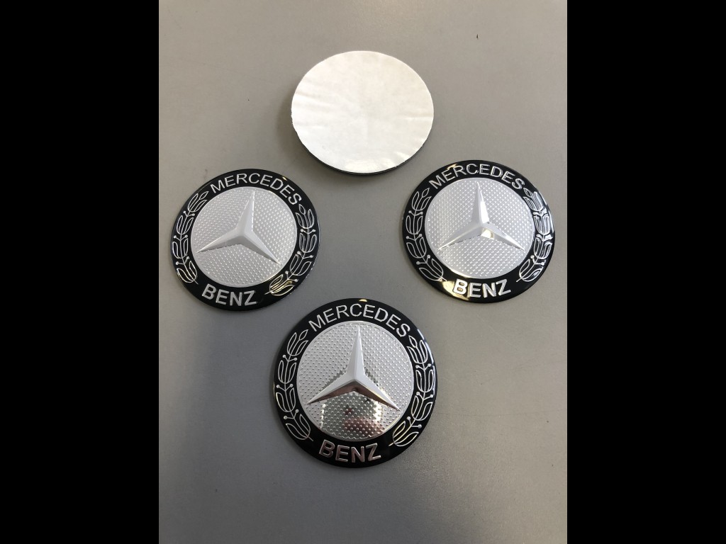 Mercedes 56 Černé Nabízím 4ks/sada středových pokliček (samolepky). Průměr 56 mm. Podklad hliník, montáž nalepením(oboustranná lepenka). Vypouklé. Cena za sadu