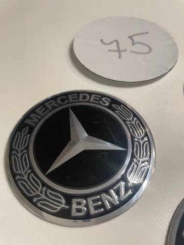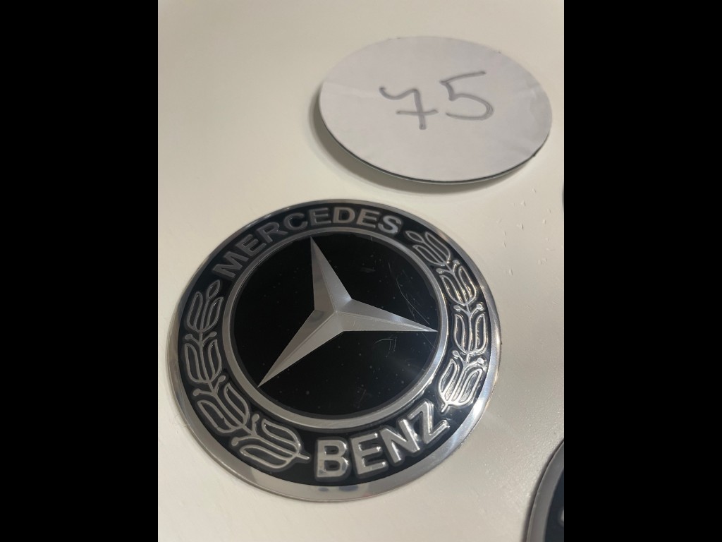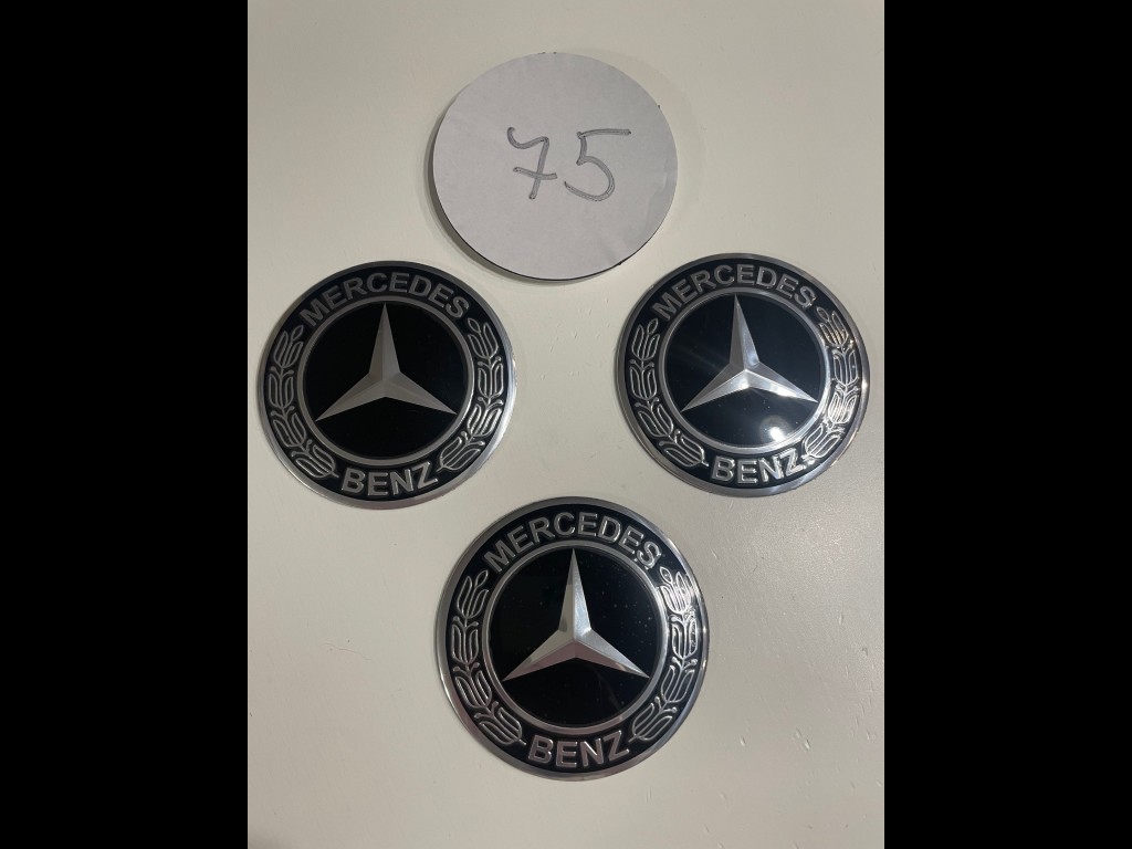 Mercedes. Nabízím 4ks/sada středových pokliček (samolepky). Průměr 75 mm. Podklad hliník, montáž nalepením (oboustranná lepenka). Vypouklé. Cena za sadu.